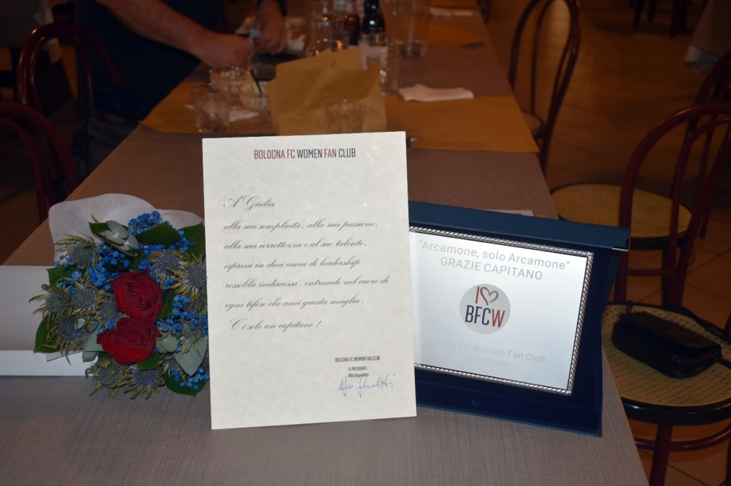 Ma andiamo con ordine. In una calda sera di giugno, con una società impegnata su altre priorità, i ragazzi del Bologna FC Women Fan Club hanno fatto quello cui colpevolmente nessuno ha pensato: hanno celebrato Giulia Arcamone. L’hanno ringraziata, abbracciata, omaggiata. In una parola: onorata. Una parola che altrove, evidentemente, non risuona più con la stessa forza.