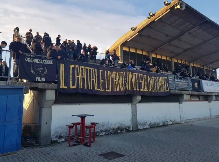 “IL CAPITALE UMANO VINCE SUL DIO DENARO” fu quello che si decise di scrivere sullo striscione. Una sintesi perfetta del sentimento che accompagnava la scelta di rimanere a Marcon, tra le persone con cui si erano creati i maggiori legami umani e con cui si condividono tutt’oggi valori e ideali che vanno ben oltre un rettangolo di gioco. Chiaramente, nel suddetto messaggio è racchiusa anche una leggera ma ben assestata stoccata, in punta di fioretto, alla controparte veneziana: lo scopo della critica era quello di favorire una riflessione a chi di dovere su un atto divisivo sotto tutti i punti di vista (due Venezia femminile). Peccato che non venne colta e anzi, l’arroganza dei soldi con cui era stato costruito il Venezia Fc trovò corrispondenza con quella dei loro esponenti dirigenziali, in particolare l’altezzosa e senza vergogna direttrice tecnica che, dopo l’esecuzione della coreografia ad inizio partita, andò a chiedere ai dirigenti nero-oro di far togliere ai loro tifosi lo striscione perchè ritenuto offensivo. Questo episodio rafforzò nei supporters (allora non ancora riuniti sotto il famigerato nome “Tifosi non Schifosi”) ulteriormente l’idea che erano state fatte tutte le scelte più giuste, dal non seguire il progetto femminile arancioneroverde all’espressione pubblica di un pensiero in questa forma massima di tifo.