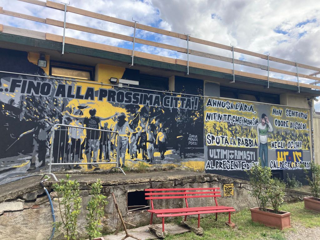 Andare a fare il tifo nella partita di ritorno a Maggio in un contesto fuori dagli schemi ordinari come il centro sportivo di Tavarnuzze (periferia di Firenze e allora teatro delle partite casalinghe del C.S. Lebowski) fu un viaggio altrettanto emozionante per i Tifosi non Schifosi, capitanati dal loro leader Filo. Già all’arrivo al campo si respirò subito l’atmosfera magica di un luogo dove il tifoso è protagonista: una zona bar ideale per i momenti di aggregazione pre e post-match, i murales della “Curva Moana Pozzi” che trasudano storia, l’accoglienza dello staff locale (non fecero pagare l’ingresso a Filippo in segno di rispetto e lo aiutarono a portare gli “attrezzi del mestiere” in tribuna) e delle ragazze della squadra grigionera che sopraggiungevano alla spicciolata all’impianto e si ricordavano della partita d’andata… Non si potè non lasciare il segno anche qui, nella casa della squadra degli Ultras, con i cori ritmati dall’incessante tamburo e con il calore dei fumogeni!