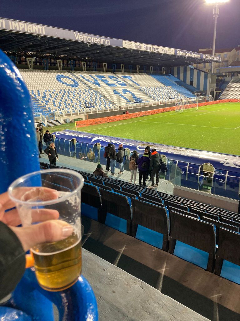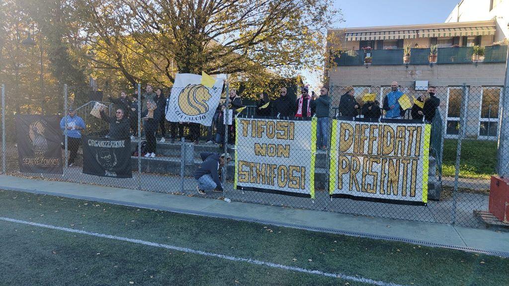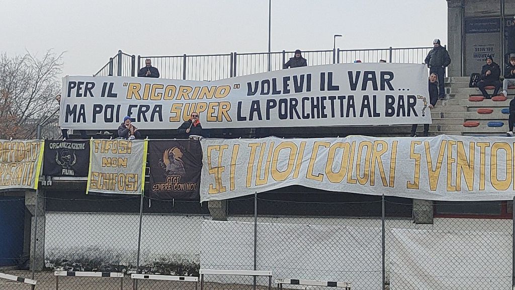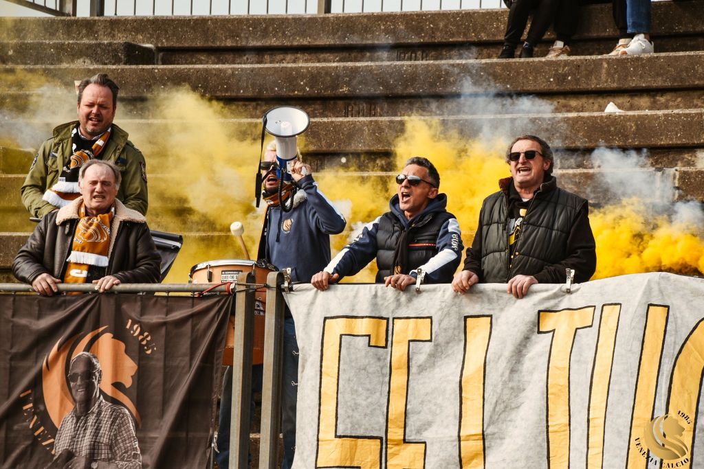 Un nuovo importante capitolo della stagione sportiva 2023/2024 si scrisse nella successiva trasferta a Padova, in un derby veneto sempre molto sentito sul campo. A livello coreografico, i Tifosi non Schifosi prepararono qualcosa di probabilmente molto ambizioso ma forse al di sotto degli standard spettacolari a cui hanno abituato la loro squadra nel corso degli anni: lo striscione col logo societario e attorno le bandierine nero e gialle sventolate dai tifosi e simpatizzanti nero-oro al seguito non diede probabilmente lo stesso “colpo d’occhio” di sempre. Detto ciò, si creò però una bella e gagliarda atmosfera di tifo che accompagnò per novanta minuti una altrettanto vivace partita sull’insidiosissimo campo del Vermigli di Padova.