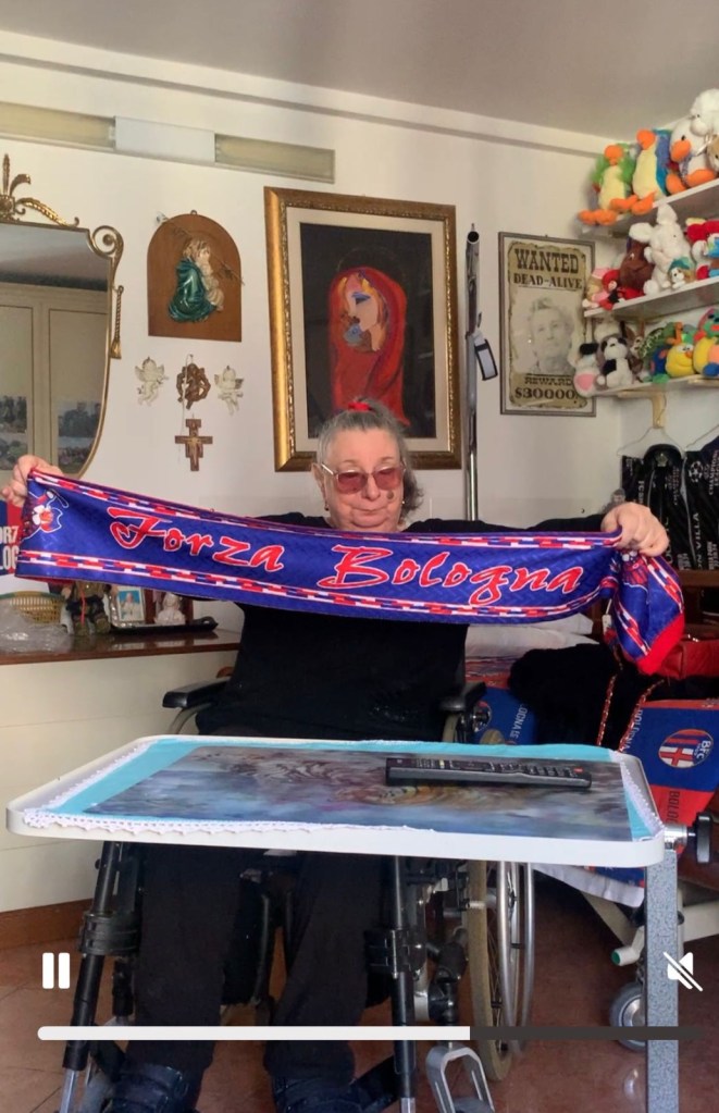 Elena è costretta su una carrozzina e vive in una struttura di cura, ma la sua voce è forte, la sua anima limpida, il suo cuore ruggisce come quello della Curva Andrea Costa. Questa intervista, ve lo dico con sincerità, mi ha commosso profondamente. Alla fine, ho pianto. Ma erano lacrime di gratitudine: per essere nato anche io a Bologna, per condividere con Elena l’amore per questi colori, per aver potuto raccontare una storia che trabocca di umanità vera.
