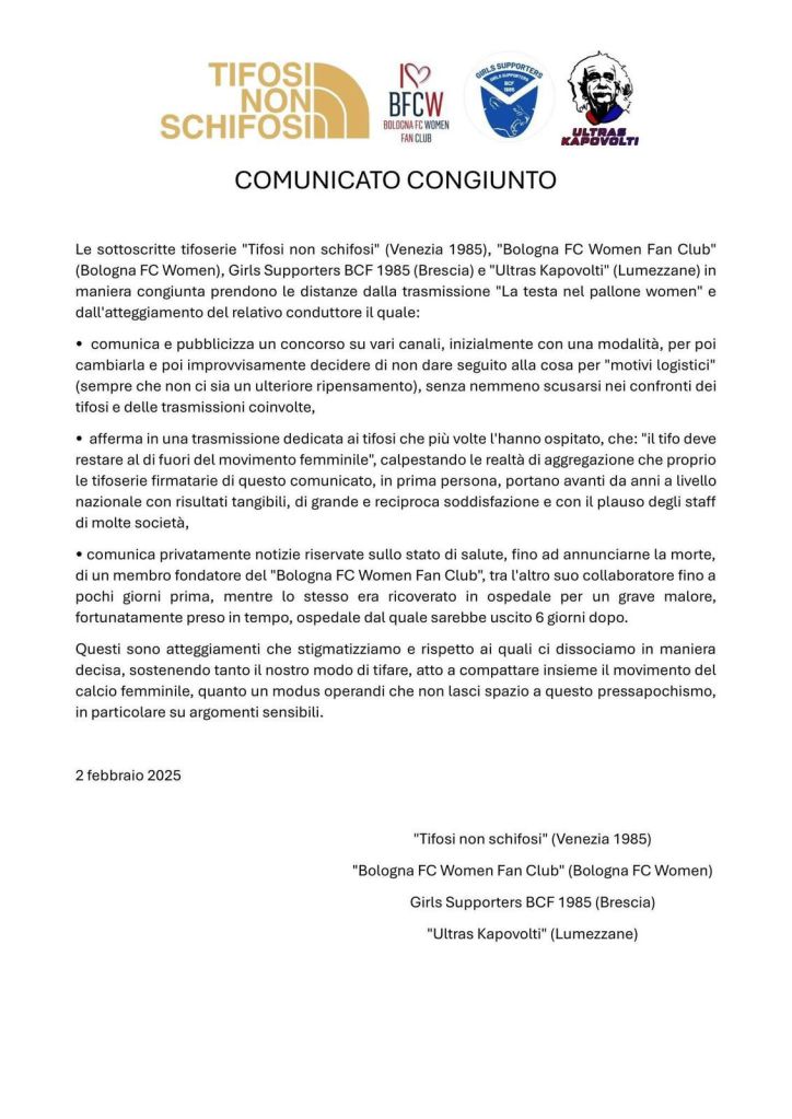 Memorabile e storico fu, in tal senso, il comunicato stampa congiunto firmato dalle tifoserie di Venezia 1985, Bologna Women, Brescia Calcio Femminile e Lumezzane: la ferma condanna del conduttore di una tristemente nota trasmissione di calcio femminile ebbe grande risalto e raccolse attestati di stima trasversalmente da varie società, dirigenti, giornalisti, tecnici e giocatrici.