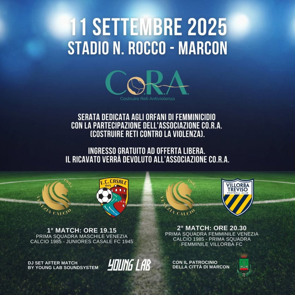 Il calcio emoziona, la musica unisce e la solidarietà può cambiare vite. Giovedì 11 settembre 2025, lo Stadio N. Rocco di Marcon ospiterà una serata speciale dedicata agli orfani di femminicidio: ogni gol, ogni applauso, ogni nota musicale sarà un gesto di speranza per chi ha perso tutto.