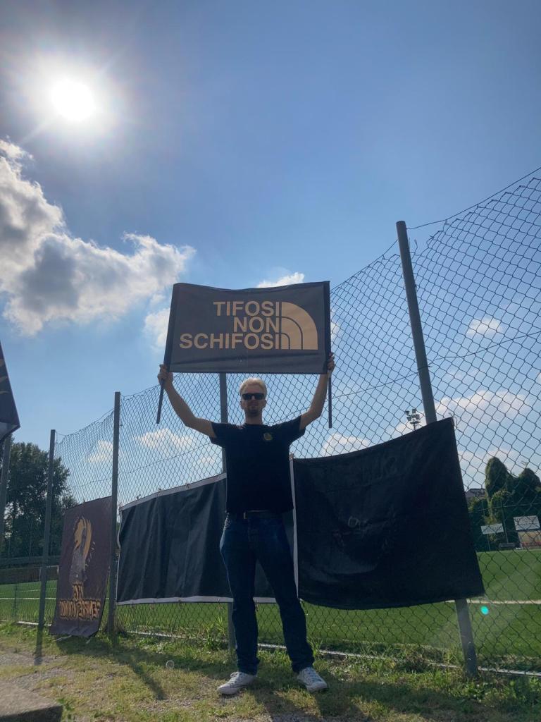 Dopo pranzo, ci si è spostati verso l’impianto di gioco e Filippo, leader della tifoseria nero-oro, ha allestito il suo angolo di tifo in tribuna dove poter dar nuovamente voce al suo entusiasmo e alla sua passione. Per quest’anno, ci sono novità nei materiali utilizzati: un nuovo striscione “Tifosi non Schifosi” capeggia frontalmente rivolto verso il campo, insieme agli ormai storici ed indimenticabili “Gigi sempre con noi” e “Organizzazione Filini”. Sui gradoni, oltre al classico stendardo a due aste “Tifosi non Schifosi”, sventolano anche le graffianti nuove bandiere firmate dal sempre presente gruppo organizzato al seguito delle ragazze.