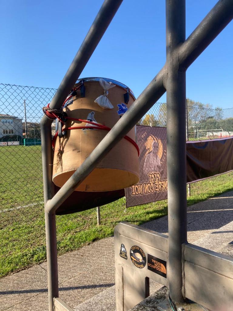 Dopo il pranzo con menù sportivo nella canonica location in terra berica, il gruppo squadra si è diretto verso il campo di gioco: un impianto diverso da quello che aveva ospitato la partita di Coppa Italia, ma simile nella disposizione degli spalti. Filo ha prontamente scaricato il materiale di tifo dal pullmino ed è andato a prendere posizione, allestendo il suo rispettabile angolo sui gradoni.