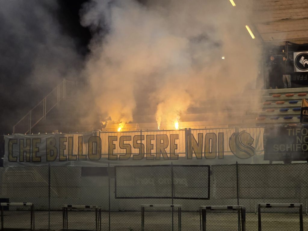 Importante, in tal senso, l’apporto dei “Tifosi non Schifosi”, che si sono prodigati, congiuntamente alla società, nell’organizzazione di un ambiente il più confortevole ed accogliente possibile. Il solito Oliviero si è impegnato nel preparare 9 kg di patatine fritte per tutte/i i presenti. Ciononostante, il discorso tifo (nel senso stretto del termine) non è stato messo in disparte e anzi, ha fatto ancora una volta la sua bella figura, rendendosi protagonista di una coreografia di altissimo livello. Non è stata facile la gestione: a circa quindici minuti dal calcio d’inizio, Filippo si è lanciato in una folle doppia corsa contro il tempo al supermercato di fronte al campo, per recuperare alcune materie prime che risultavano mancanti alla realizzazione del post-partita. Portata a termine con successo la “missione”, si è riportato tempestivamente e instancabilmente sugli spalti per accendere la passione canora e visiva: le luci stroboscopiche bianche e i bengala gialli hanno illuminato la serata al “Nereo Rocco” e messo in evidenza il maestoso striscione esposto davanti sul parapetto della tribuna, dal chiaro significato identitario (non propriamente una novità, visto che era già stato impiegato nella stagione precedente… Ma l’effetto ottenuto è stato sicuramente originale e dal forte impatto): CHE BELLO ESSERE NOI.