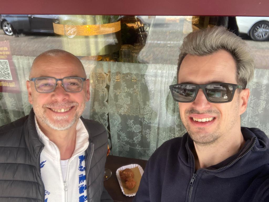 La fiducia nel poter vivere una grande domenica di tifo e di sport si è alzata ulteriormente con la visita dell’amico Gianluca, storico lanciacori (e non solo) dei “Brescia Girls Supporters”: arrivato col treno in stazione a Mestre verso metà mattinata, è stato recuperato dal “collega” nero-oro Filippo ed accompagnato in un ampio e sobrio percorso di avvicinamento alla partita. Insieme hanno consumato un ricco aperitivo presso un’ osteria lì vicino abbastanza rinomata (“Hostaria Vite Rossa”, per i curiosi e per chi ama anche conoscere luoghi, culture, tradizioni ed emozioni uniche attraverso un itinerario calcistico): i due hanno trascorso piacevolmente un’oretta tra spritz, cicchetti, mozzarelle in carrozza e polpette intercalati da aneddoti calcistici e non.