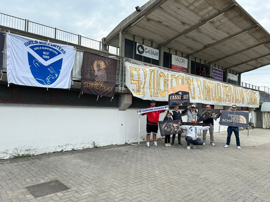 Dopo le gustose “fatiche” a tavola, è giunta quindi l’ora di entrare in azione al campo sportivo: dal punto di vista degli striscioni esposti, semplicemente alla classica disposizione casalinga è stato aggiunto il drappo degli amici bresciani.