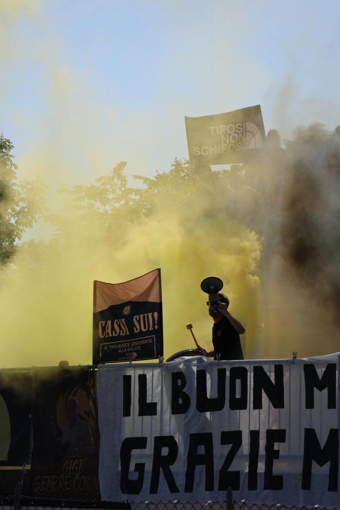 Ad accompagnare la maestosa scritta, una bella e stilosa fumogenata all’ingresso in campo delle squadre, per colorare un momento dall’alto impatto emotivo.